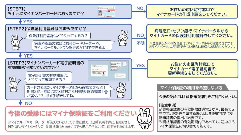 ※マイナンバーカードの健康保険証利用登録状況が分からない場合は、マイナンバーカードをお手元に準備して、こちらのリンクよりマイナポータルへログインいただきご確認ください。 マイナポータルHP